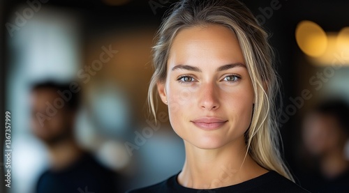 woman in a white hoodie stands calmly against a gray background with a casual, minimal fashion look