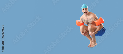 Handsome male swimmer with inflatable armbands doing cannonball jump on blue background
