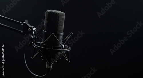 A focused shot of a black condenser microphone with a dark background and a microphone stand arm