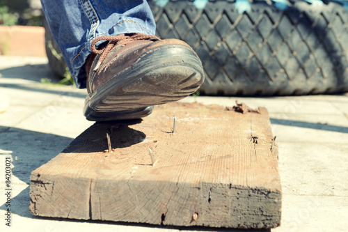 Worker steps on nail outdoors