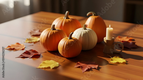 Adorable Pastel Kawaii Pumpkins and Autumn Leaves on a Cozy Mat for Fall Decor