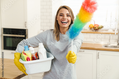 Photo of woman housewife holding cleanser bottles and colorful duster