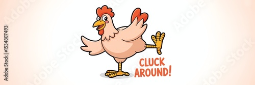 Illustrated chicken cartoon joyfully dancing with text 'Cluck Around!' on a light background.