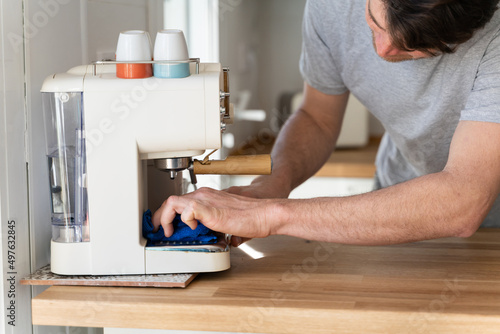 Unrecognizable woman preparing fresh aromatic coffee, using a coffee machine maker in cozy office kitchen