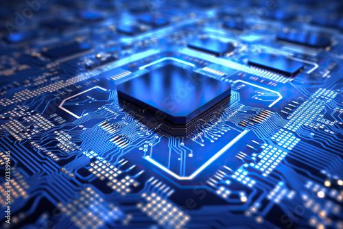 close up of a microchip circuit interior of a computer with neon lights in detail, circuit board.