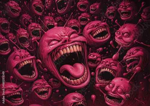 A disturbing image of numerous monstrous entities, their faces contorted in unsettling laughter