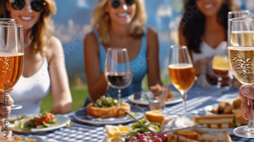 Cheers to the Good Life: A convivial gathering of friends enjoying a lavish outdoor feast, raising glasses filled with diverse beverages in a moment of pure camaraderie.