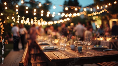 Elegant outdoor summer dinner party with rustic wooden table, string lights, place settings, and guests enjoying evening gathering under warm ambiance