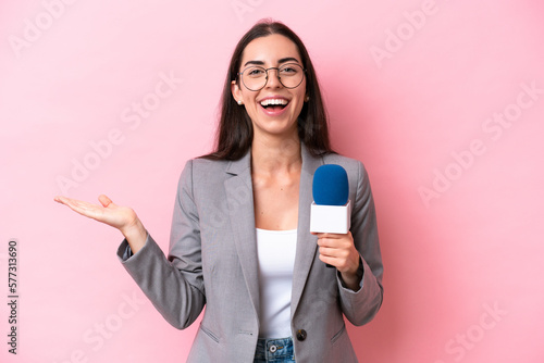 Young caucasian tv presenter woman isolated on pink background with shocked facial expression