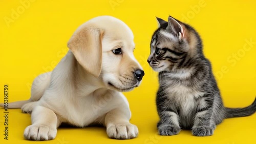 Playful puppy and curious kitten interacting on vibrant yellow background