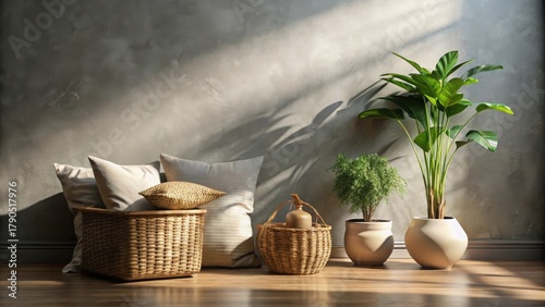 Serene Interior Design with Natural Textures and Sunlight Illuminating Woven Baskets, Cushioned Pillows, and Lush Potted Plants