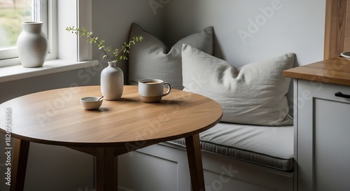 Round wooden table with mug vase bowl sits near window cushioned bench in bright neutral kitchen