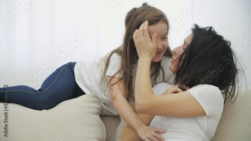 Funny little girl climbed on the back of the sofa and is hugging her mother, then they are disarranging each others hair.