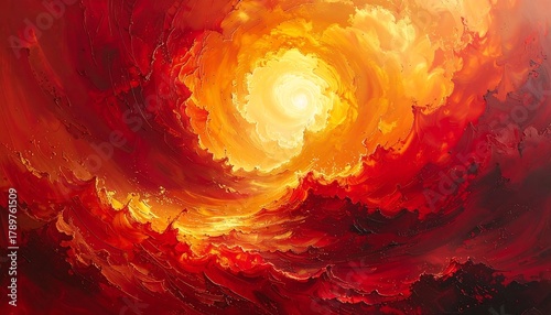 A vibrant, swirling, abstract depiction, dominated by fiery reds and golds. A luminous core bursts forth