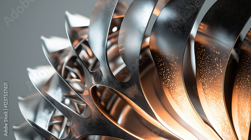 A close-up image of an airplane turbine engine, the fan blades lit dramatically with strong side lighting to emphasize the metallic texture and precision craftsmanship