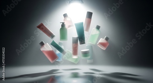 A collection of various cosmetic bottles and tubes are dramatically suspended in mid-air under a spotlight.