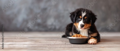 Funny little fluffy kitten eats dry food from a bowl. Kitten licks, delicious meal. Siamese or Thai cat breed
