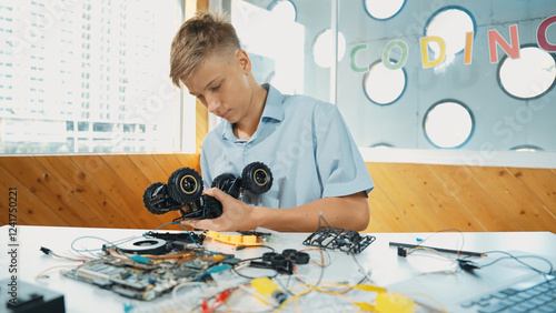 Highschool boy fixing car model with laptop and electric tool placed on table. Closeup of teenager inspect robotic machine construction while using eletronic equipment in STEM classroom. Edification.