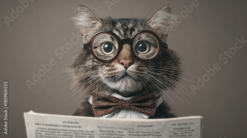 An intelligent cat wearing glasses and a bow tie while reading the newspaper, a whimsical and intellectual concept.