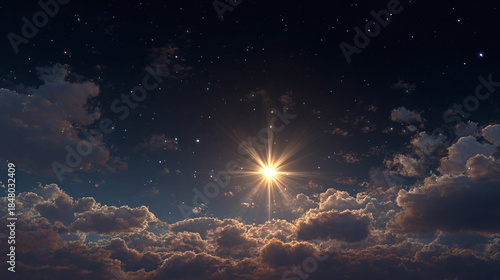 A celestial star illuminates the night sky, casting a radiant glow among fluffy clouds. The scene is both serene and captivating.