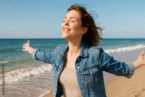 Caucasian woman enjoying the ocean breeze with open arms on a sunny beach. concept of freedom, joy, relaxation, summer vacation moment near the sea