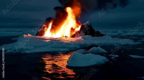 flames erupt from ice-covered rocks in Arctic Ocean, global warming concept