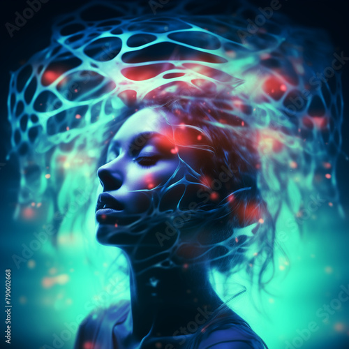 woman with glowing light in water, underwater, light cyan and crimson style, mixing realistic and fantastical elements, psychedelic figuration