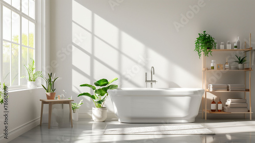 Modern spacious bathroom setting featuring a freestanding tub, big windowa and pots green plants. Modern bathroom interior design of light natural tones