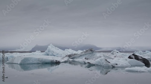 Broad view over the frozen glacial lagoon showcasing different blue arctic icebergs and snow-covered mountain range in the backdrop