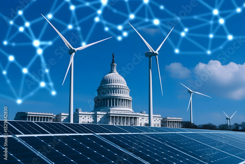 Renewable energy and governmental infrastructure. Sustainable energy sources like wind and solar power are integrated into a modern, connected government building