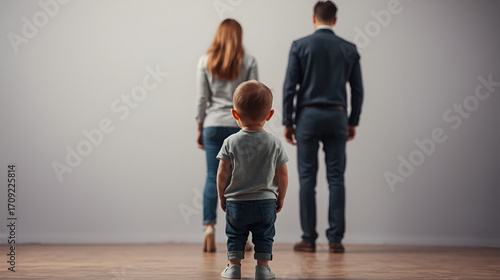 Divorce Tension, A child stands in sorrow as estranged parents face away, embodying the emotional strain of family separation.