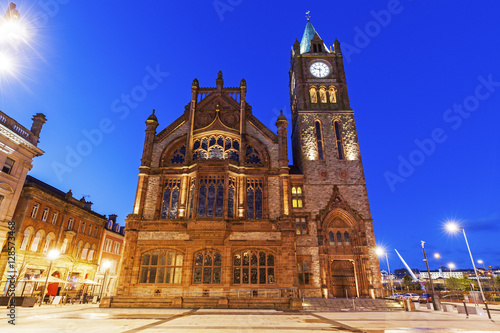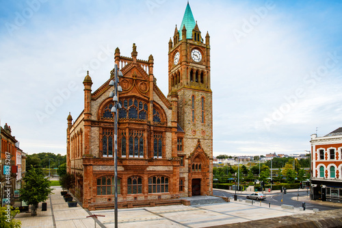 Derry, North Ireland. Aerial view of Derry Londonderry city center in Northern Ireland, UK. Sunny day with cloudy sky, city walls and historical buildings