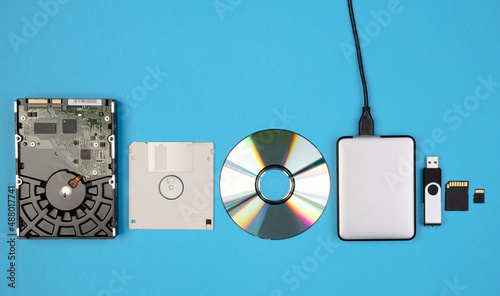 Data storage devices such as CDs, hard drives, pen drives and other, top view on a blue background with copy space