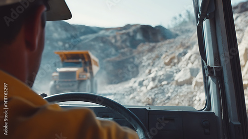 Mining laborer driving a haul truck loaded with lithium ore across the mining site. Featuring truck driving