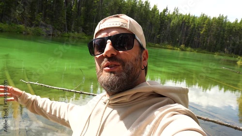 Bearded tourist vlogging at herbert lake, showcasing the stunning turquoise water and surrounding forest in banff national park, canadian rockies