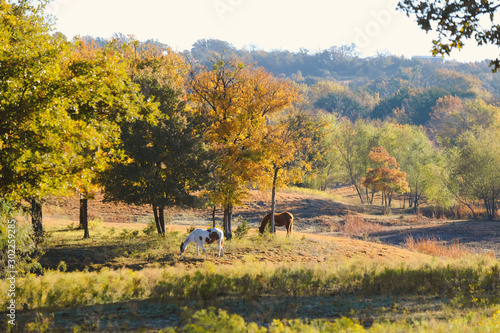 Rural Texas autumn landscape during fall season in nature, horses grazing under tree.
