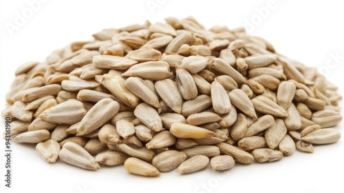 A pile of sunflower hulled seeds neatly arranged, isolated on a white background, showcasing their natural texture and color.