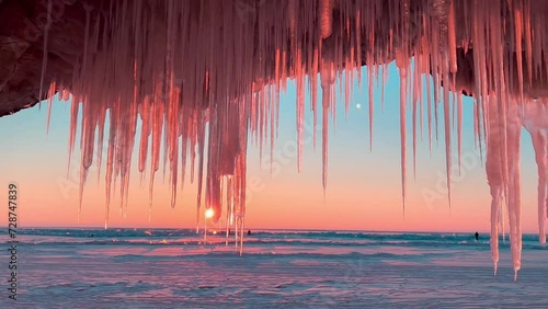 Frozen winter lake Baikal, Siberia, Russia. Ice icicles and blocks in the rocks, grottoes and caves at dawn. Natural background of cold ice. Winter abstract background. High quality 4k footage
