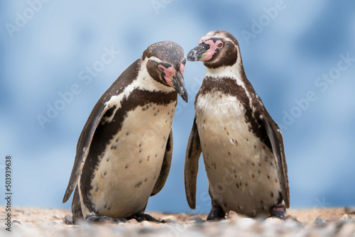 closeup of two isolated humboldt penguins in conversation with each other, natural water birds in a cute animal concept, symbol for gossip, rumor, indiscretion or environment protection
