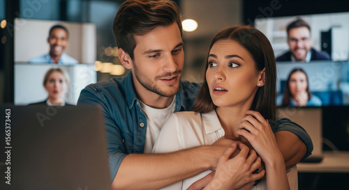 Colleagues working on laptop, communicating via video call in the evening close-up. Man hugging woman, office romance, cheating at work