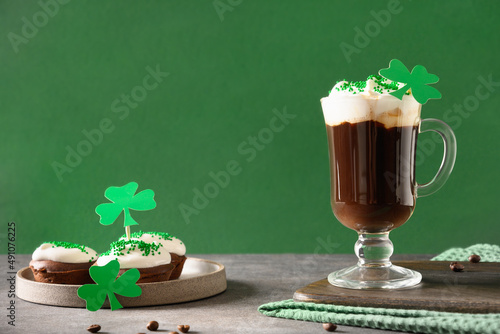 Irish coffee and tradition cupcakes for St Patricks Day on green background. Happy st patricks day.