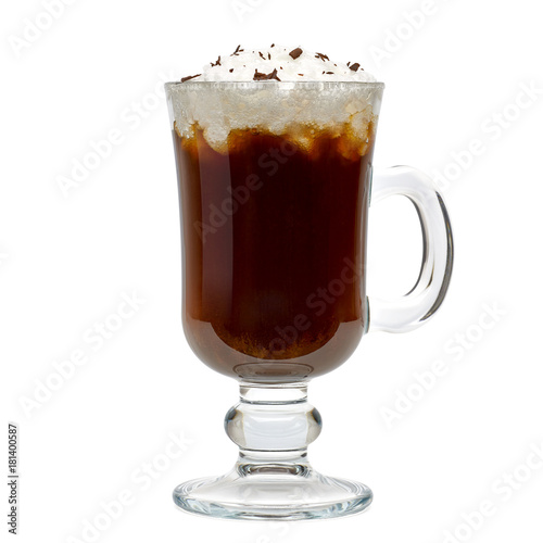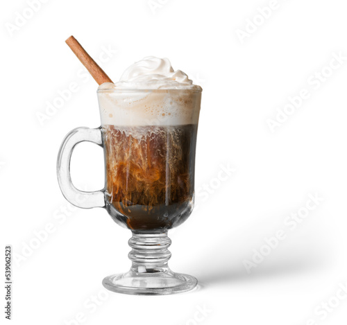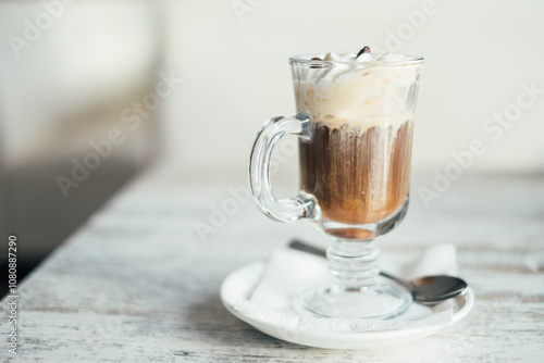 Close-up of an Irish coffee with whipped cream on a wooden table