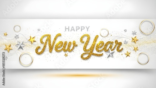 Festive Happy New Year Banner with Golden Glitter Text, Silver Stars, and Abstract Design