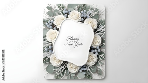 Elegant White Rose and Berry Floral Wreath New Year Card Illustration with 'Happy New Year' Text