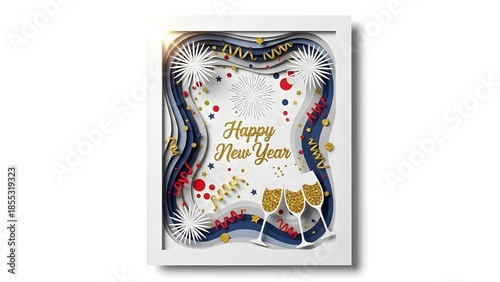 Happy New Year Paper Cut Illustration with Fireworks, Champagne Glasses, and Confetti