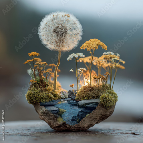 A surreal miniature composition featuring a dandelion and wildflowers growing on a small stone island with a stream.