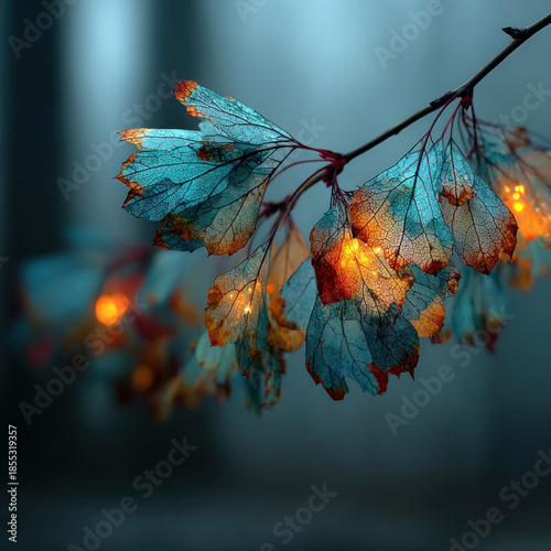 An artistic macro scene featuring translucent autumn leaves on a slender branch, illuminated by a warm golden light against a cool, blurred background