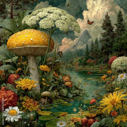A fantasy painting illustration of a fairytale forest landscape with a large mushroom, flowering plants, and a tranquil forest pond.
