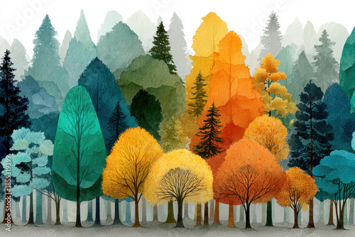 An artistic watercolor illustration of a forest landscape with trees of various species and shades.