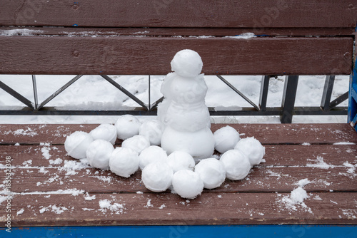 Small snowman and snowballs made with a snow mold maker on a wooden bench in winter. Winter activity and outdoor fun concept.